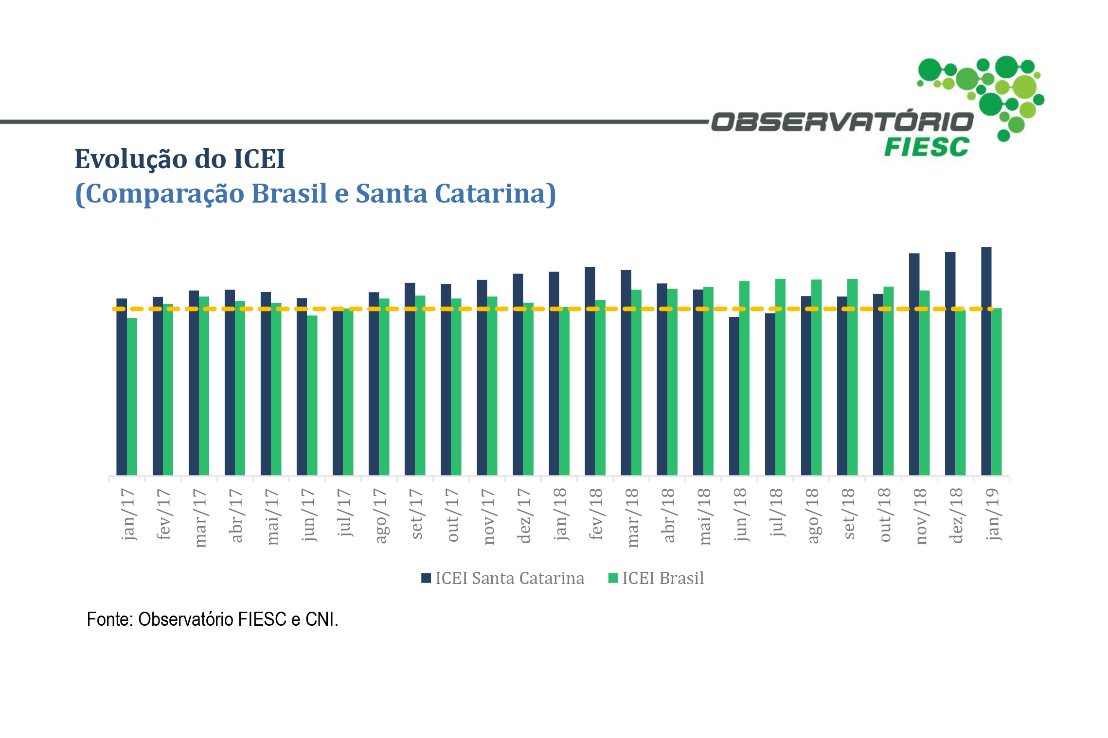 Florianópolis, 23.1.2019 – Os empresários da indústria catarinense iniciaram o ano mais confiantes. O índice de confiança passou de 67 pontos para 68,5 pontos em janeiro, alta de 1,5 ponto, mostra pesquisa Índice de Confiança do Empresário Industrial, divulgada pela FIESC, nesta quarta-feira (23). No Brasil a confiança atingiu 64,7 pontos, registrando aumento de 0,9 ponto na passagem do mês. Clique aqui e confira a pesquisa na íntegra.