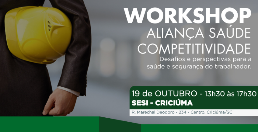 Florianópolis, 18.10.2016 – A FIESC, por meio do SESI e com o apoio do IEL, promove nesta quarta-feira (19) o workshop Aliança Saúde Competitividade, para discutir saúde e segurança do trabalhador. O encontro, que será realizado no Auditório do SESI, a partir das 13h30min, objetiva consolidar e priorizar as necessidades das indústrias relacionadas ao tema. A iniciativa é da Aliança Saúde Competitividade.