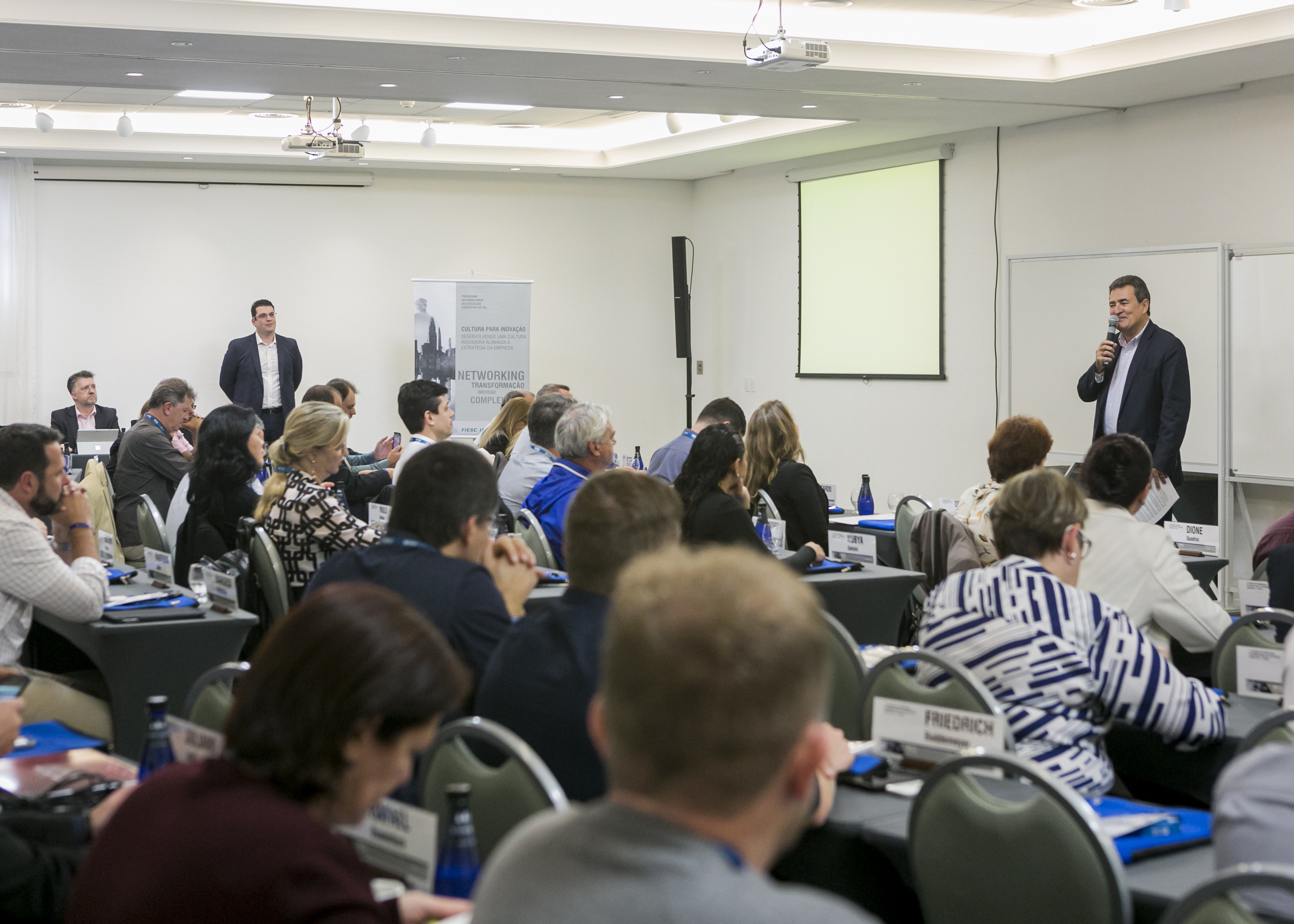 Florianópolis, 18.9.2018 – Lideranças empresariais participam esta semana (17 a 19 de setembro) do Programa Internacional de Educação Executiva, realizado pelo IEL, entidade da FIESC. O encontro ocorre em Florianópolis e reúne 54 executivos, presidentes, CEO’s e líderes com poder de decisão de indústrias de todo o Brasil. Este ano, o curso tem parceria com o ISE Business School e aborda o tema Cultura para a inovação: Desenvolvendo uma cultura inovadora alinhada à estratégia da empresa. Em outubro, mais uma turma do programa será formada.