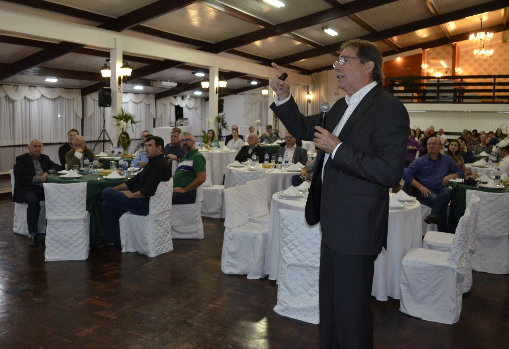 São Bento do Sul, 27.11.2019 - Em reunião com líderes empresariais de São Bento do Sul, o presidente da Federação das Indústrias de Santa Catarina (FIESC), Mario Cezar de Aguiar, destacou os diferenciais competitivos do estado. “Somos um estado de oportunidades, com a indústria mais diversificada do país, o segundo estado brasileiro no ranking de competitividade e uma das economias que vêm conseguindo superar a crise com mais eficiência”, disse. Ele ministrou palestra durante encontro promovido pela vice-presidência regional do Planalto Norte, comandada por Arnaldo Huebl. O evento foi realizado na noite desta quarta-feira, dia 27, com a participação de mais de 100 empresários da região.