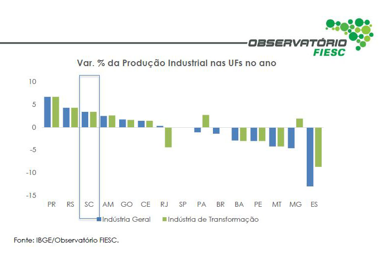 Florianópolis, 8.11.2019 – A produção industrial cresceu 3,4% de janeiro a setembro na comparação com o mesmo período do ano passado. O resultado catarinense é o terceiro melhor do país, atrás do Paraná (7,4%) e do Rio Grande do Sul (4,3%), mostram os dados do IBGE, divulgados pela FIESC. Do lado oposto, Espírito Santo (-8,7%) e Rio de Janeiro registraram (-4,4%) os maiores recuos na produção industrial. Entre as atividades que puxaram o desempenho positivo estão: máquinas, aparelhos e materiais elétricos (16,3%), produtos de metal (8,9%), veículos automotores e reboques (13,9%) e máquinas e equipamentos (3,4). Veja aqui a análise