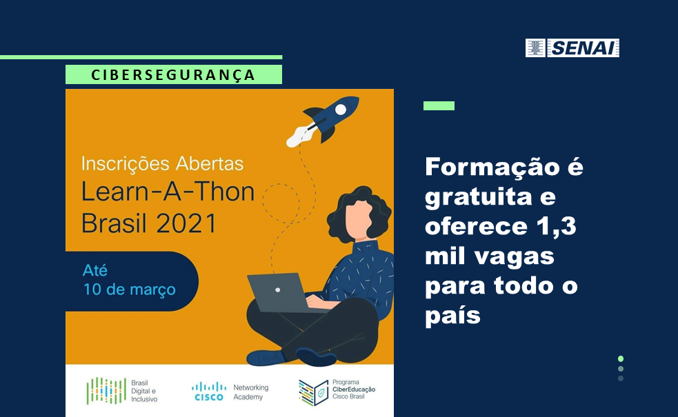 Florianópolis, 5.3.2021 - A área de segurança digital tem oferecido diversas oportunidades de carreira e o SENAI, em parceria com a Cisco, realiza um programa gratuito para formação de profissionais que queiram ingressar nesta área.  As inscrições para a maratona classificatória seguem até quarta-feira, dia 10, pelo site da Cisco ou pelas academias NetAcad do SENAI. O curso ocorre de forma 100% remota em quatro fases, sendo que a segunda etapa de formação é oferecida pelo SENAI de Santa Catarina.